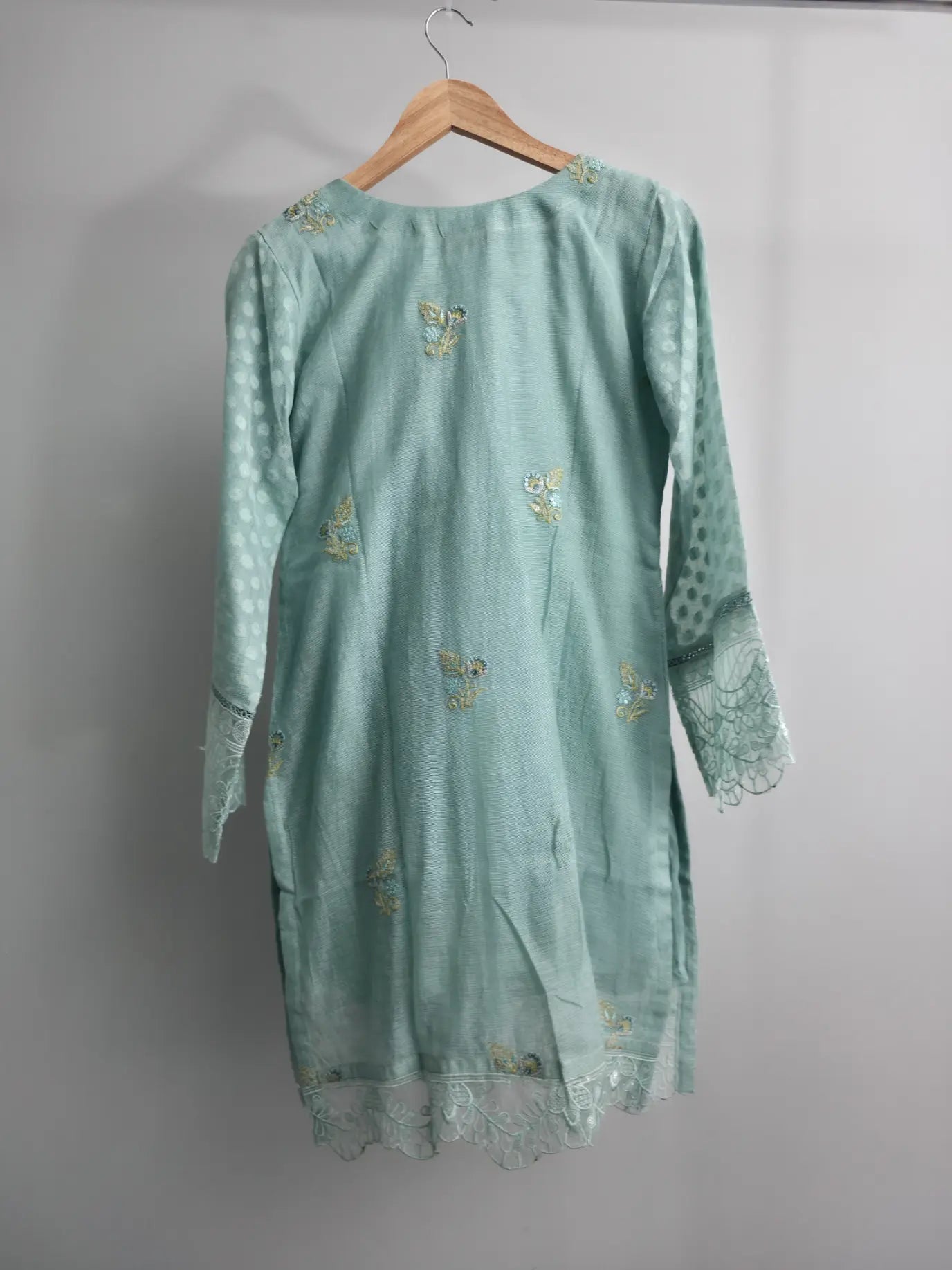 The Khaddi Cotton Net shirt is beautifully adorned with hand embellishment and intricate embroidery, enhanced by an organza embroidered border finished with delicate cutwork, creating a refined and graceful silhouette.