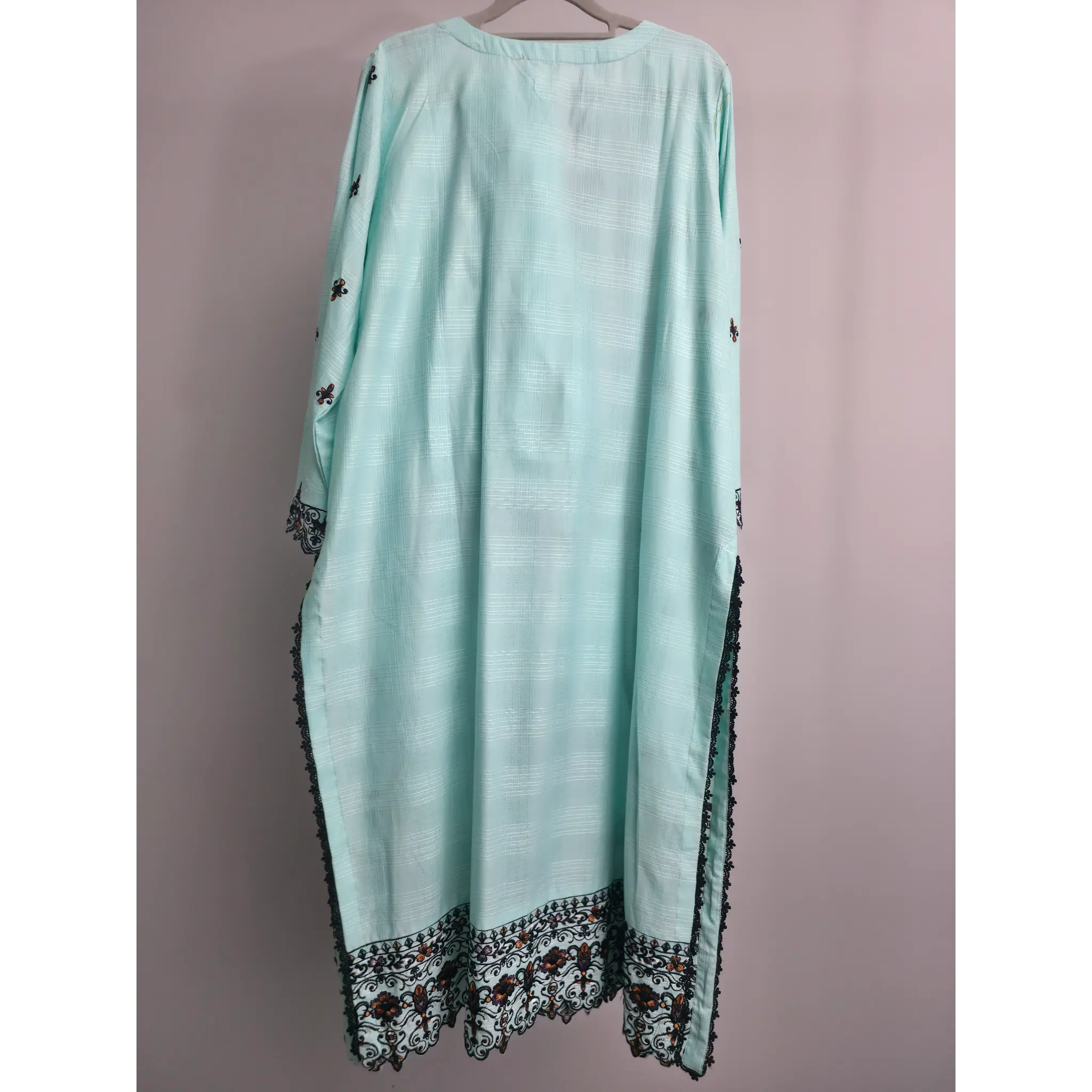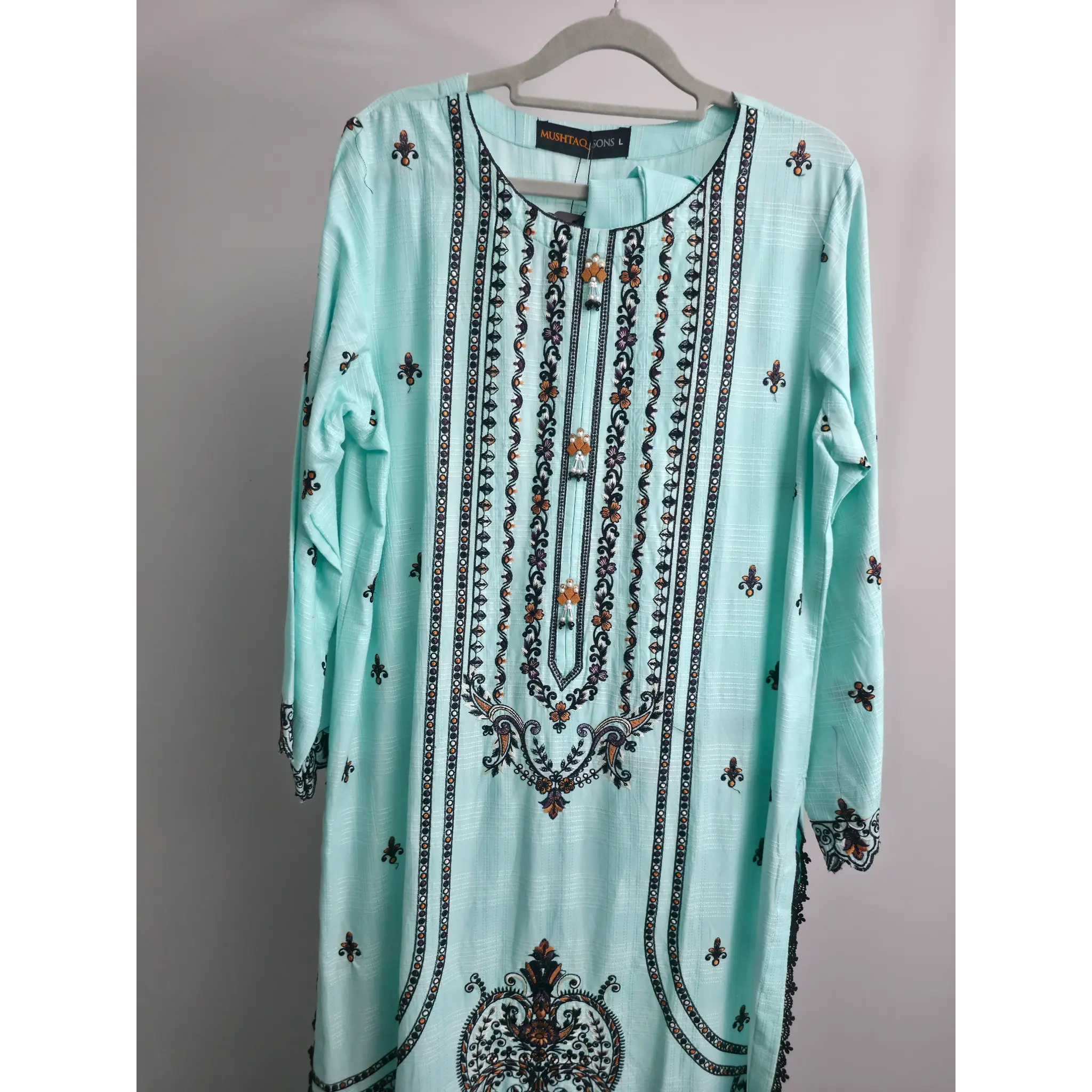 Bring refreshing elegance to your wardrobe with this aqua slub cotton 3-piece kurta set, thoughtfully designed for festive occasions, semi-formal events, and graceful everyday wear. The kurta is crafted from premium slub cotton and features striking black embroidery on the front and sleeves, creating a bold yet balanced contrast against the soft aqua base for a modern-meets-traditional look.