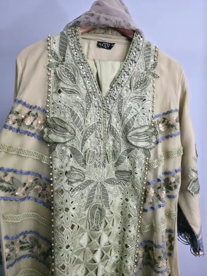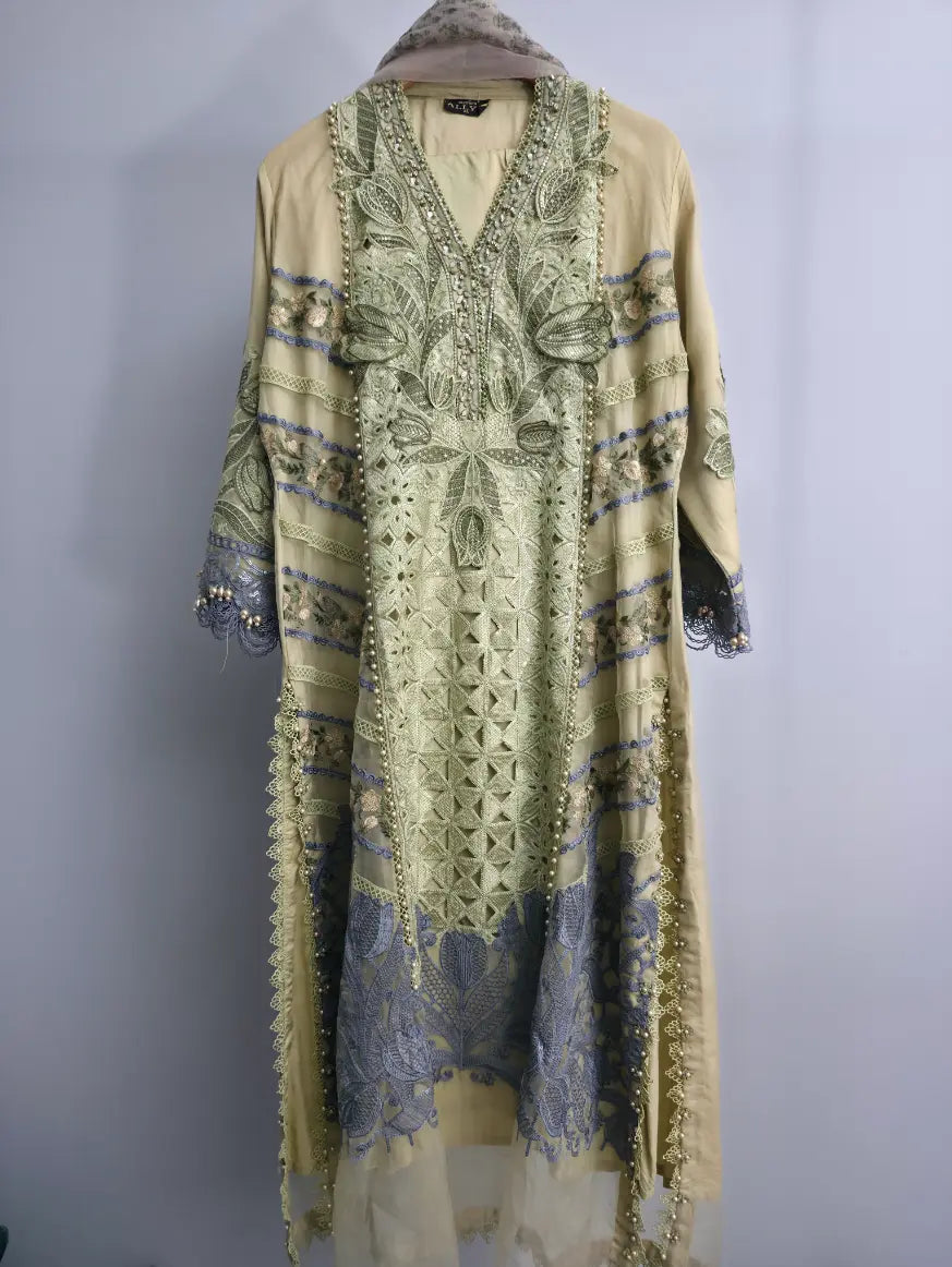 Step into timeless elegance with this beautifully crafted 3-piece stitched outfit, designed to blend sophistication with everyday comfort. The A-line shirt, tailored in premium organza, flows gracefully with a flattering length of 44–46 inches, offering a modest yet stylish silhouette suitable for all body types.