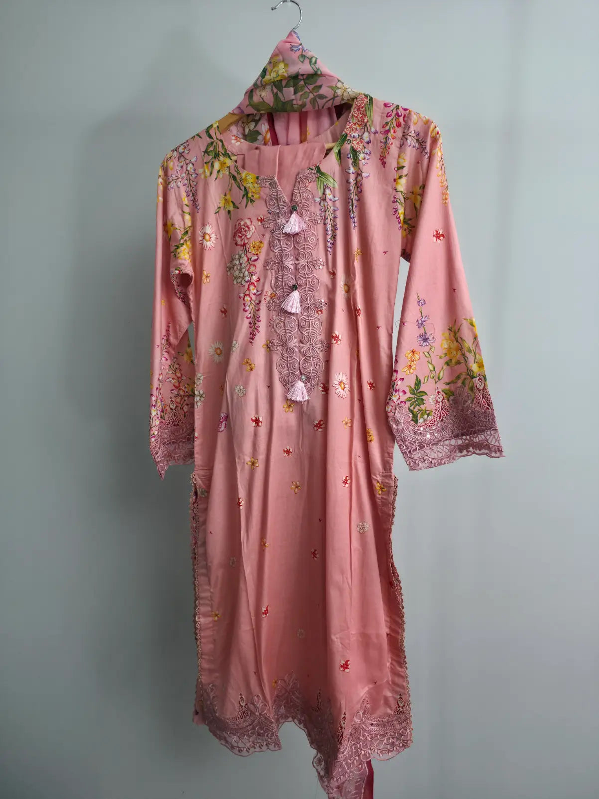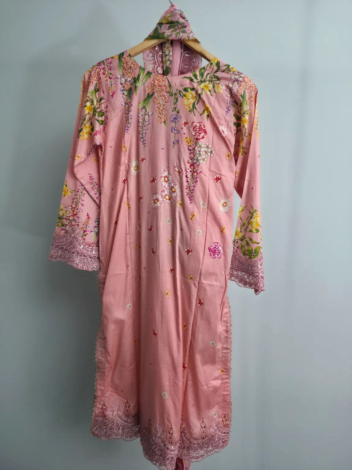 The breathable lawn shirt keeps you cool during warmer days, while the printed cambric trouser ensures a comfortable yet polished fit. A flowing printed chiffon dupatta adds softness and graceful movement to the overall look. Available in a soft and romantic pink shade, this suit is ideal for casual gatherings, daytime events, festive occasions, and summer wear.