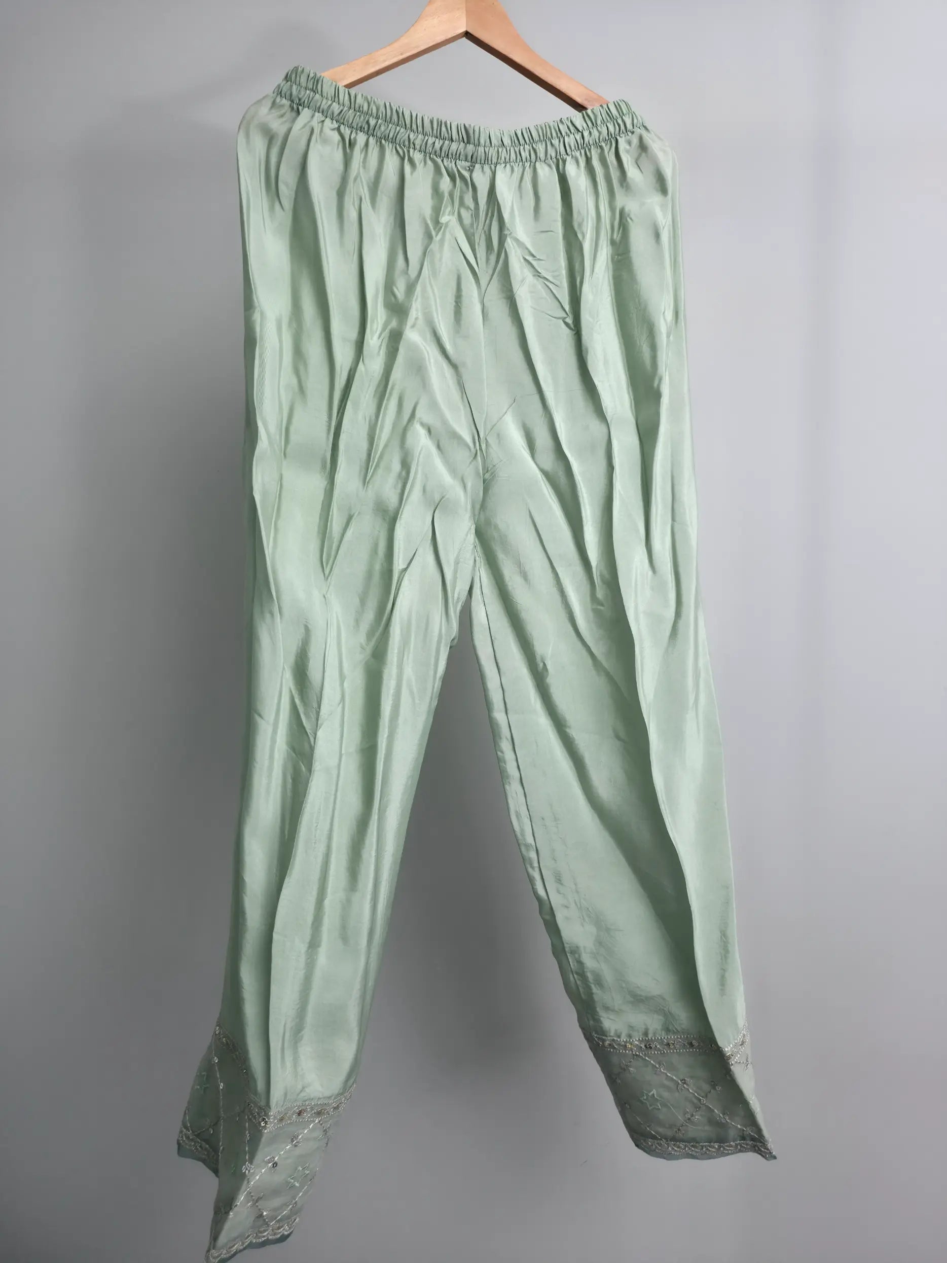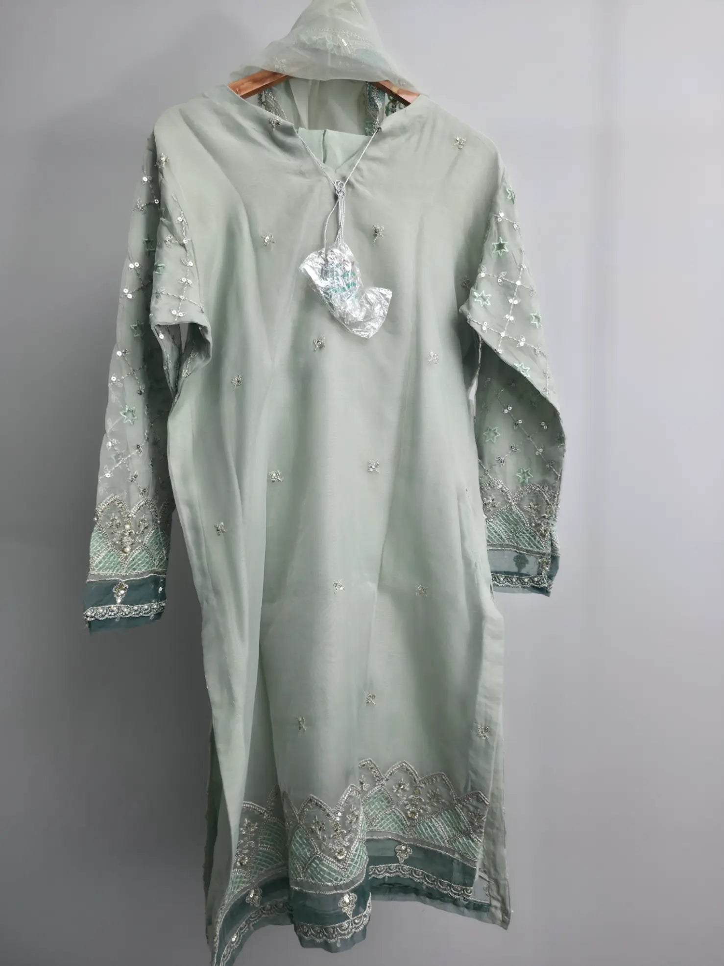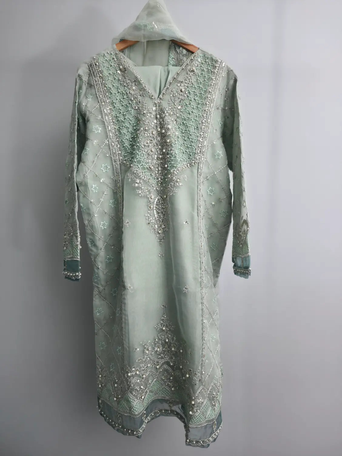 Grace your festive moments with this elegant mint green embroidered organza kurta set, designed to reflect timeless charm and sophistication. This 3-piece ready-to-wear outfit features a beautifully crafted medium-length organza kurta adorned with delicate embroidery and light embellishments, creating a refined festive look.