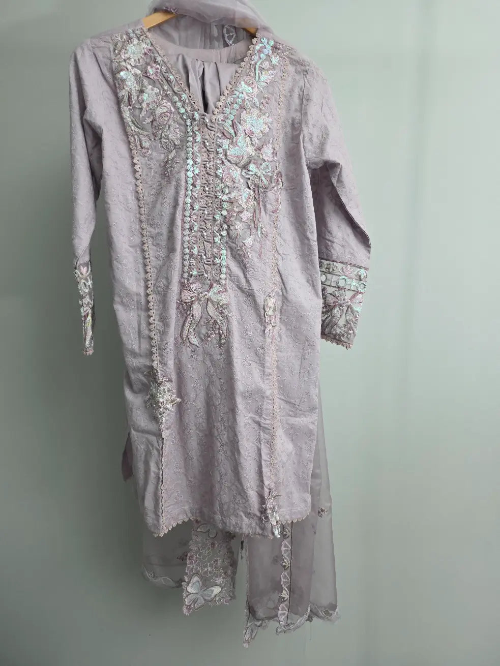This stitched 3-piece suit blends traditional craftsmanship with contemporary design, making it a perfect choice for Eid celebrations, family functions, and cultural occasions.
