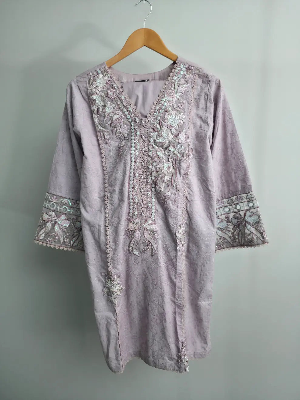 Step into effortless elegance with this beautifully crafted Schiffli & multihead embroidered summer cotton outfit, designed to keep you stylish and comfortable in warm weather. The mid-length cotton shirt is enhanced with delicate lace detailing, 3D floral accents, and refined button finishing, creating a graceful yet modern look.